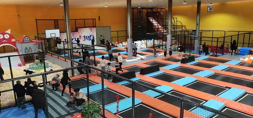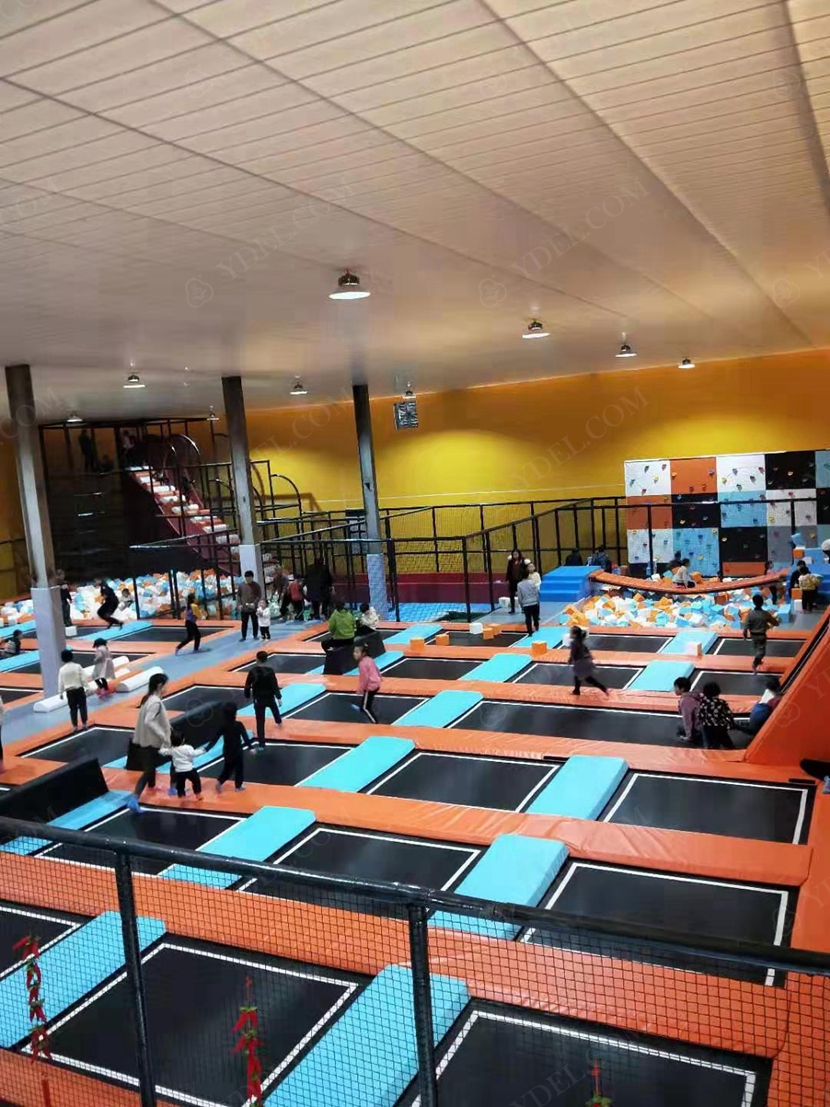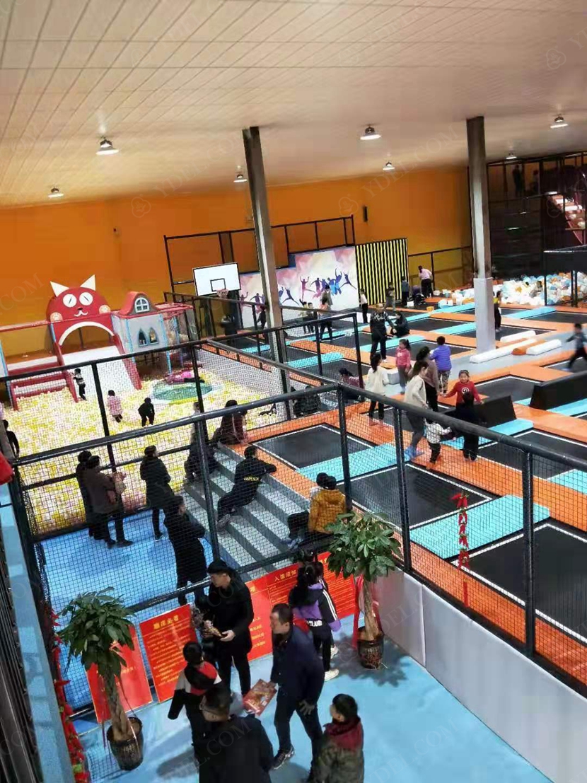 場內設有近800㎡的綜合性蹦床區,包括專業蹦床區、競技躲避球區、兒童躲避球區、跑酷區、斜蹦面區、自由彈跳區、彈跳籃球區、海綿池區